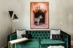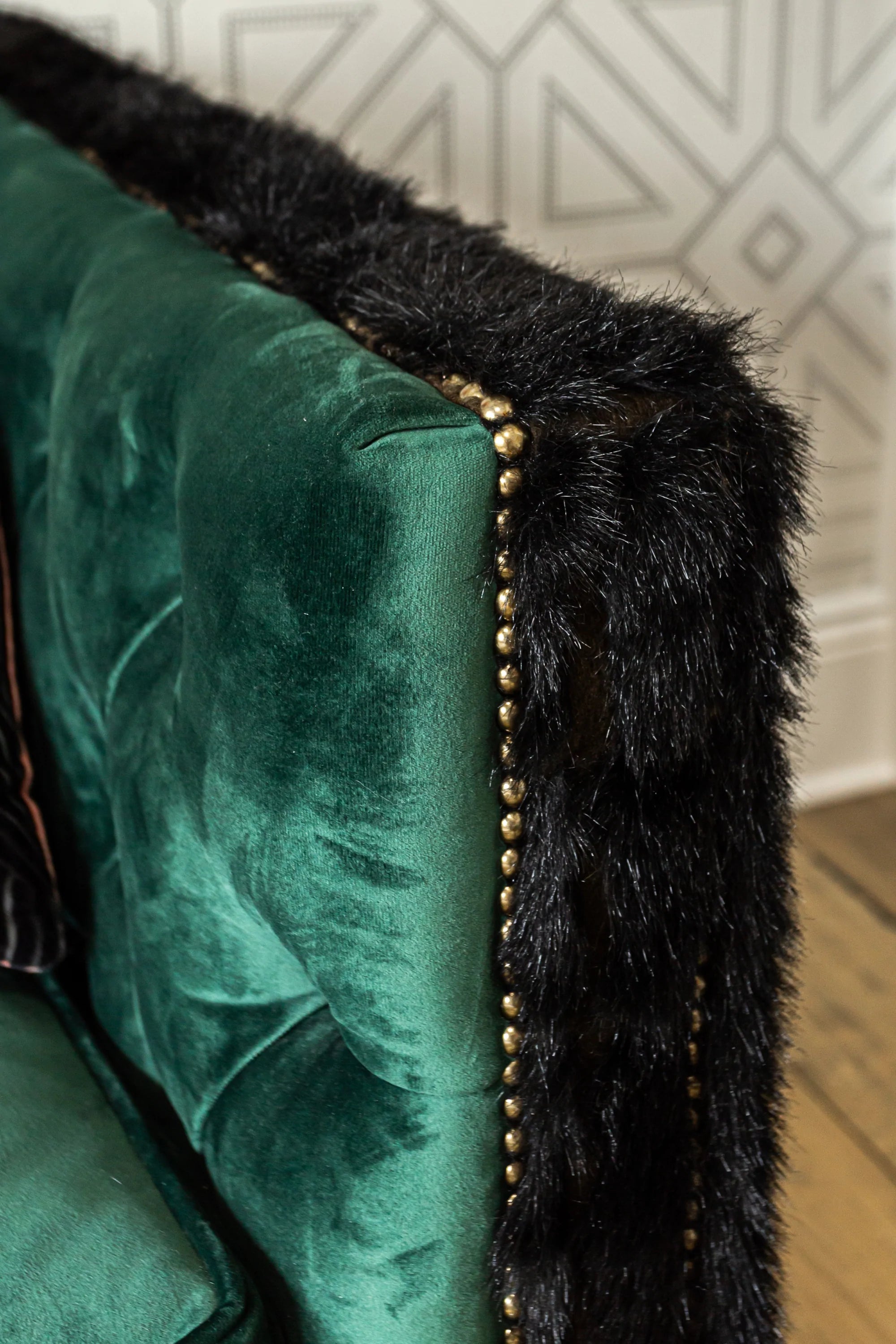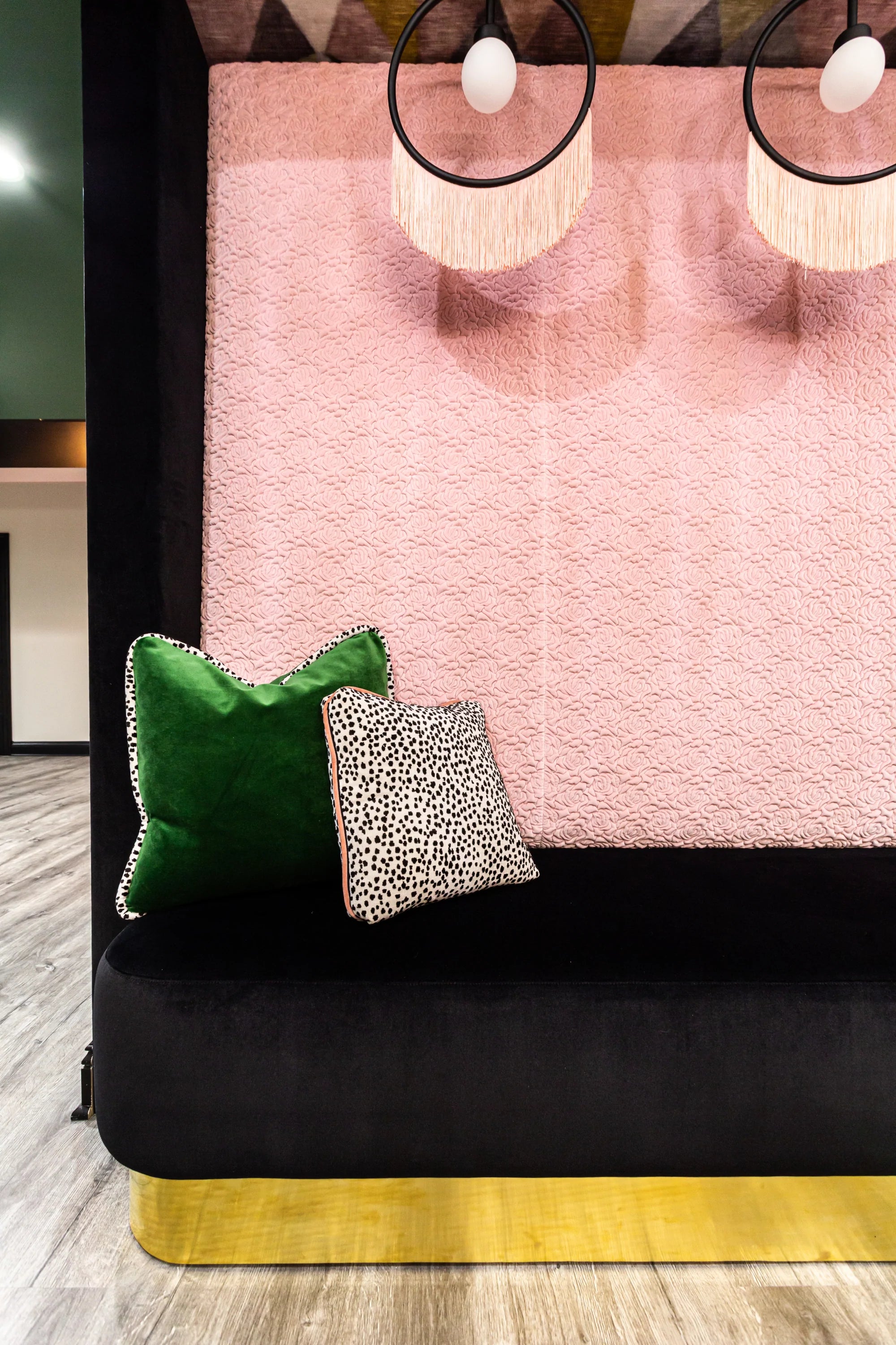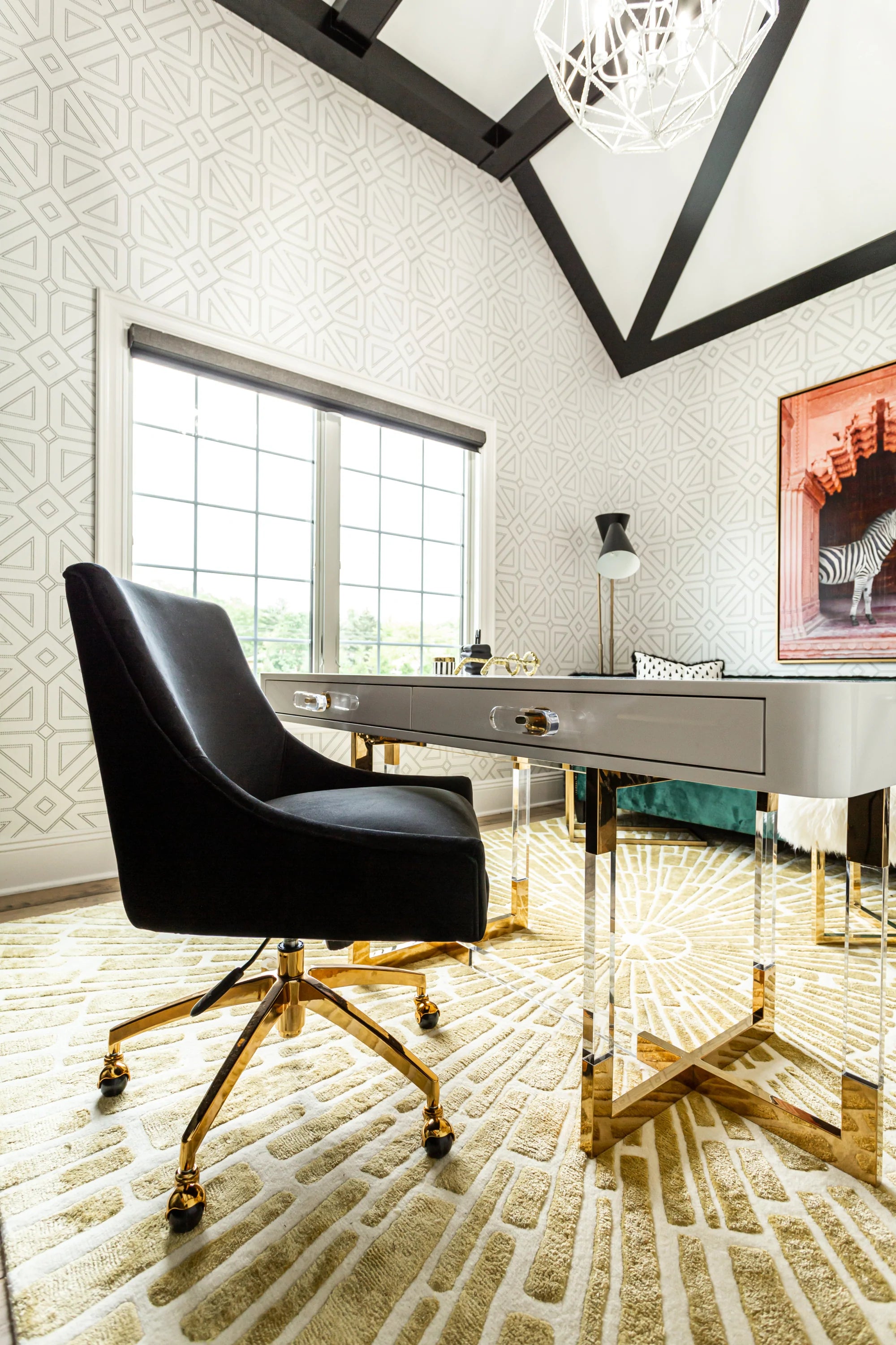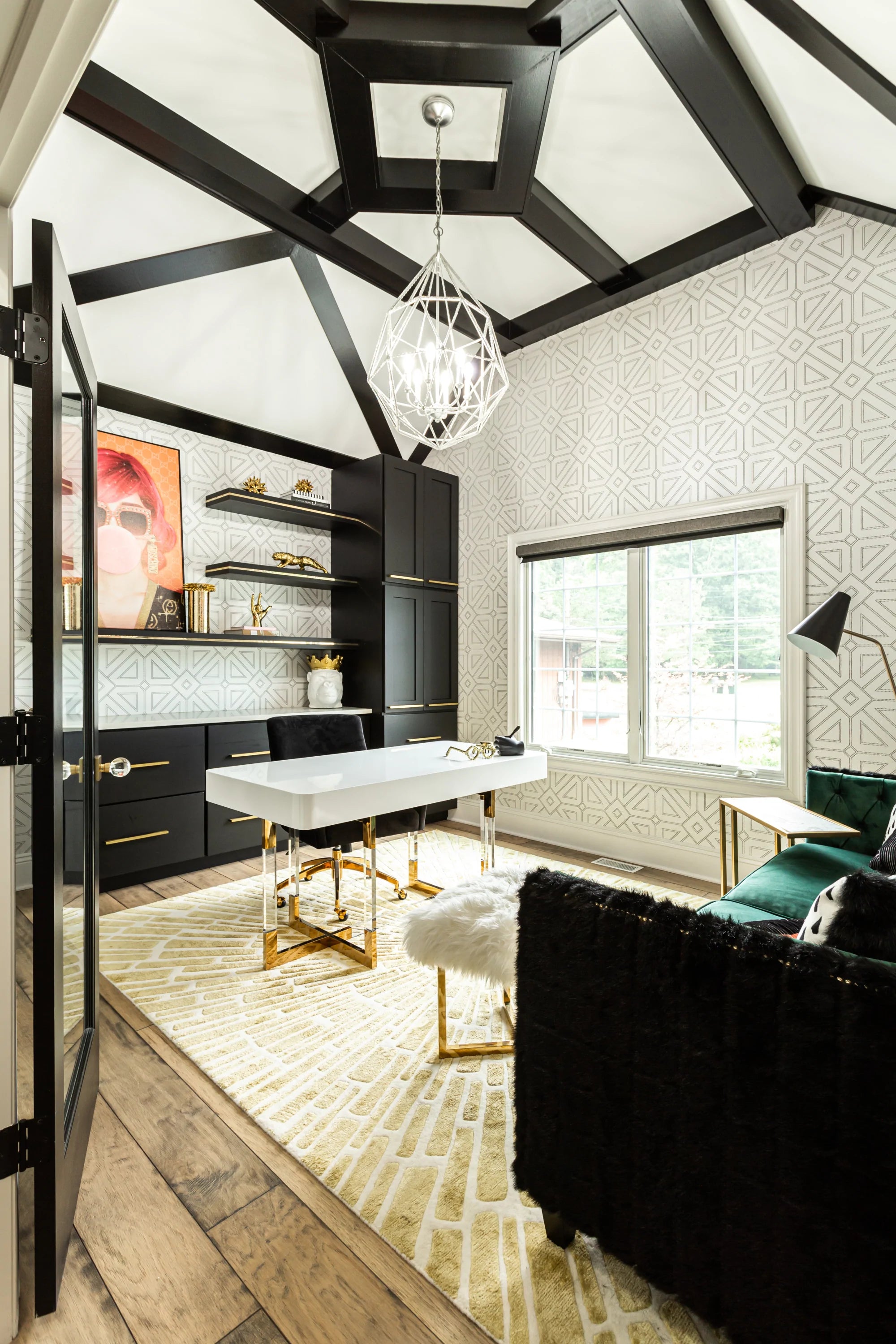 - Glamorous office with bold ceiling design and lush velvet-and-hair sofa