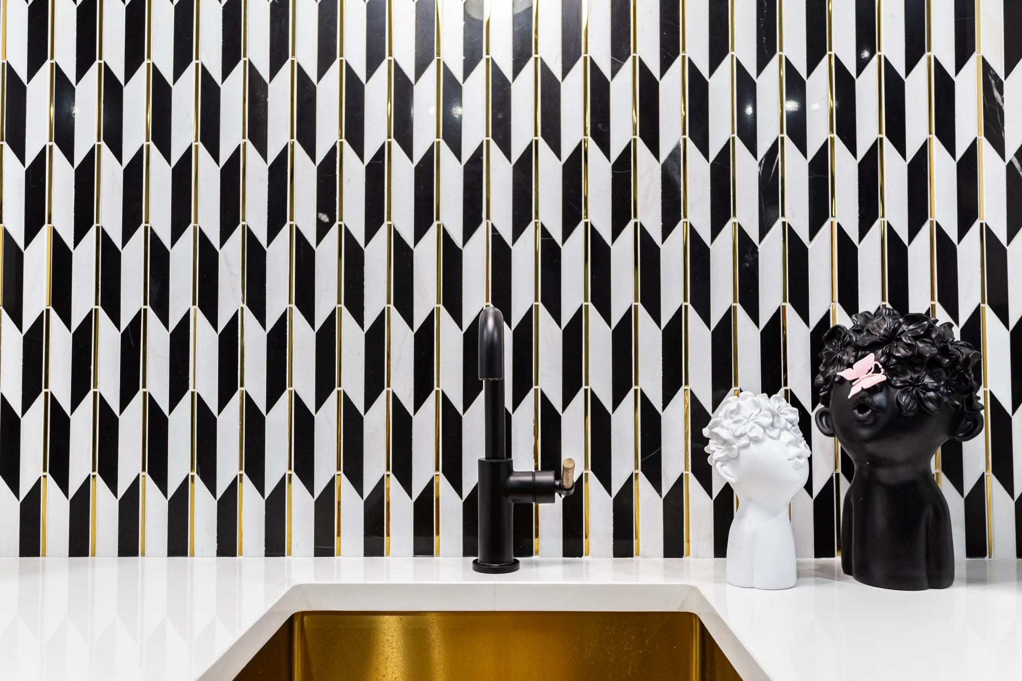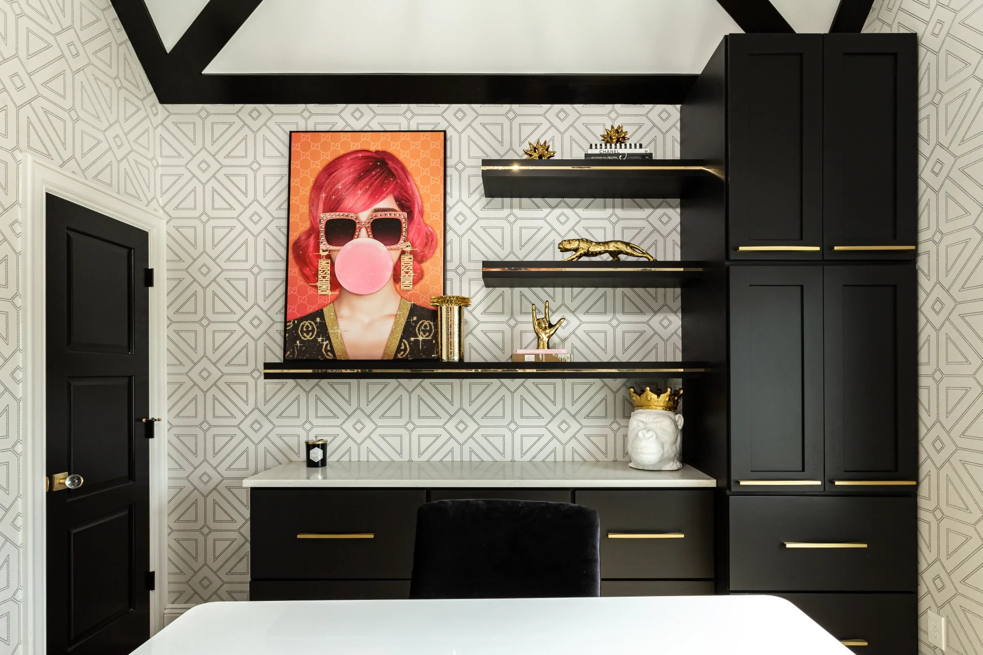 - Black-and-white kitchen with island seating, custom range, and pops of color