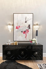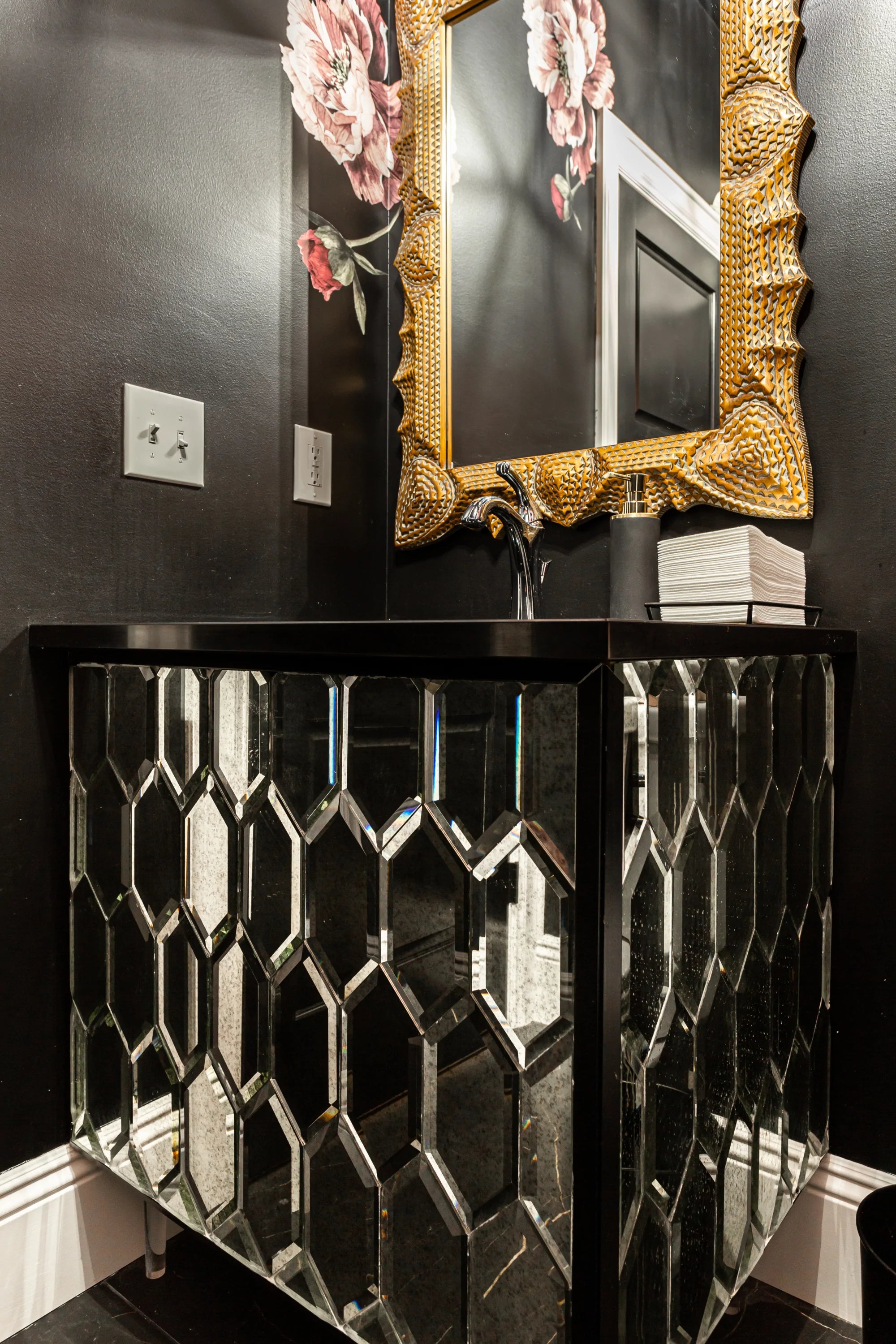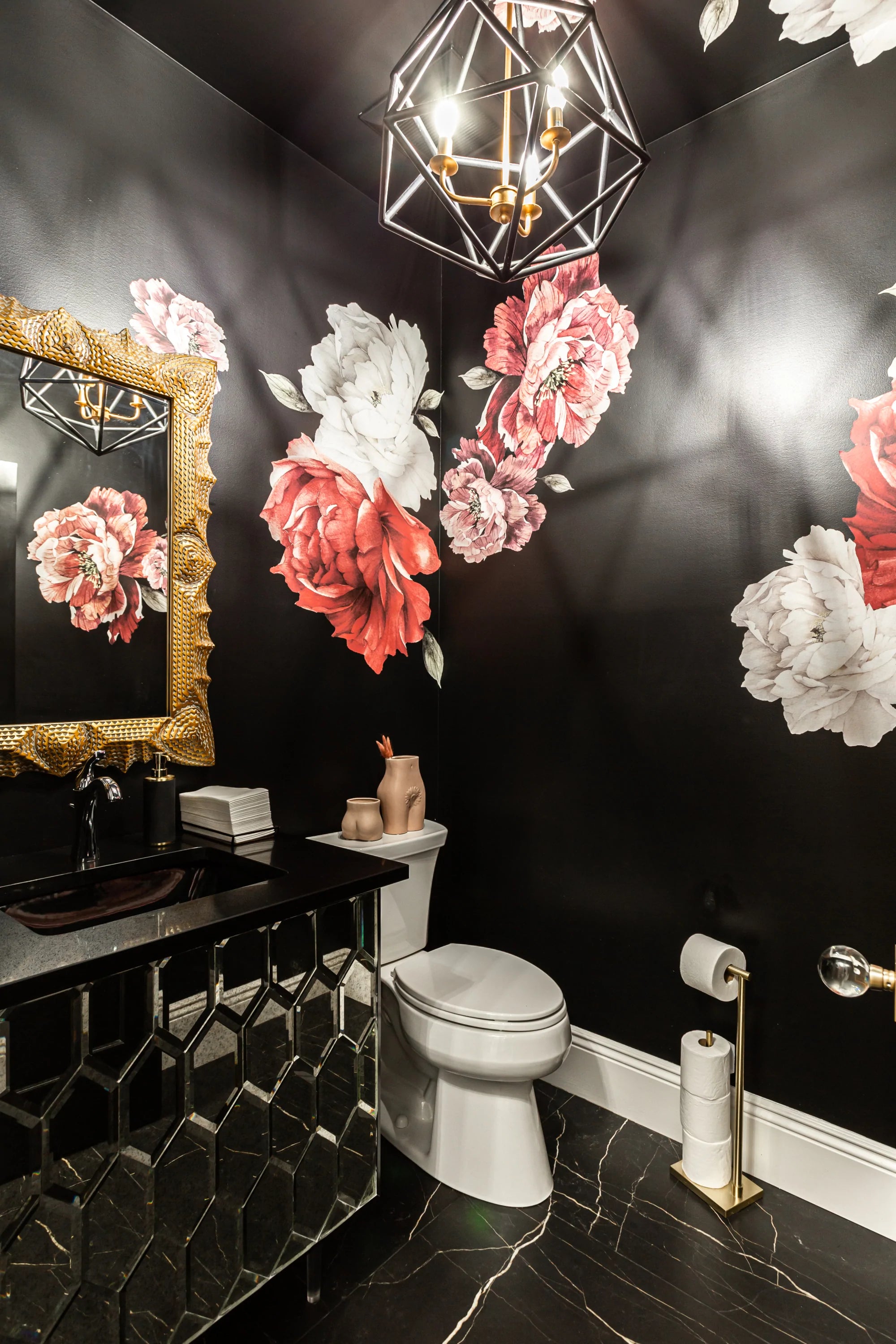 - Dramatic powder room with flower wall decor and mirror-front vanity